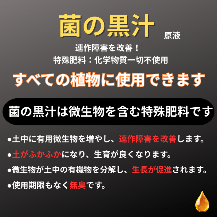 「菌の黒汁」に使用される「特殊光合成細菌」が 土中に投入されると急速に増殖し連作障害の原因となる有害菌の増殖を抑制し、植物の生育に必要なアミノ酸を生成、菌自体が高栄養で多くのビタミンを含み、アミノ酸とも合わせて植物の生育を旺盛にします。