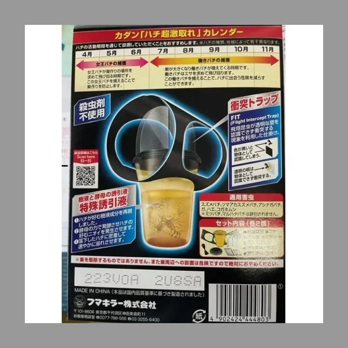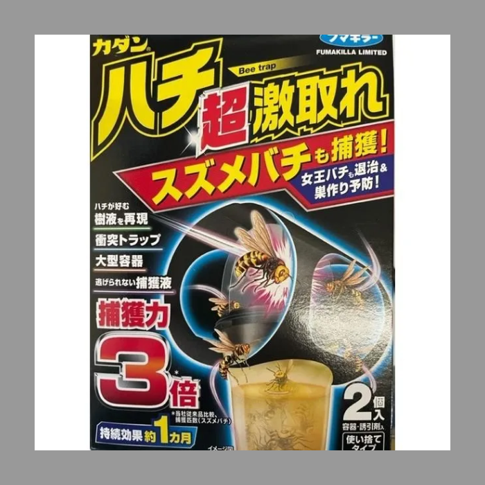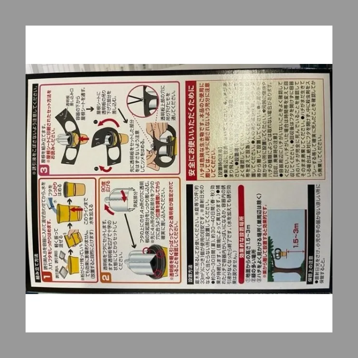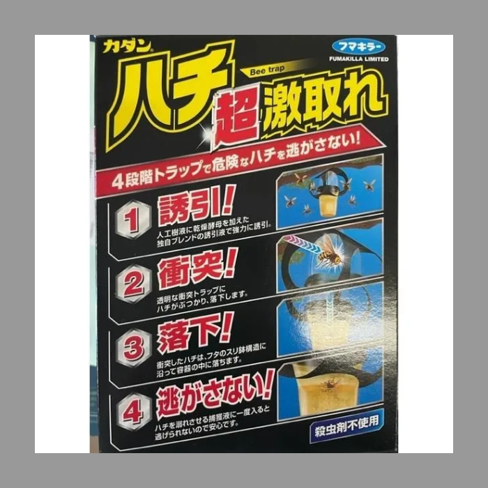 使い捨てタイプ。 特殊誘引液を使用し、庭木に吊るすだけで、ハチを誘引、捕獲、退治。